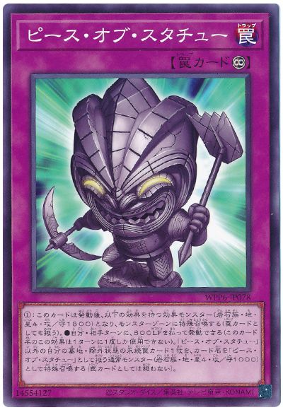 ●自分・相手ターンに、800LPを払って発動できる(このカード名のこの効果は1ターンに1度しか使用できない)。「ピース・オブ・スタチュー」以外の自分の墓地・除外状態の永続罠カード1枚を、カード名を「ピース・オブ・スタチュー」として扱う通常モンスター(岩石族・地・星4・攻/守1000)として特殊召喚する(罠カードとしては扱わない)。